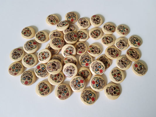 50 x 2-Hole Printed Wooden Buttons - 15mm - Round - Sugar Skulls